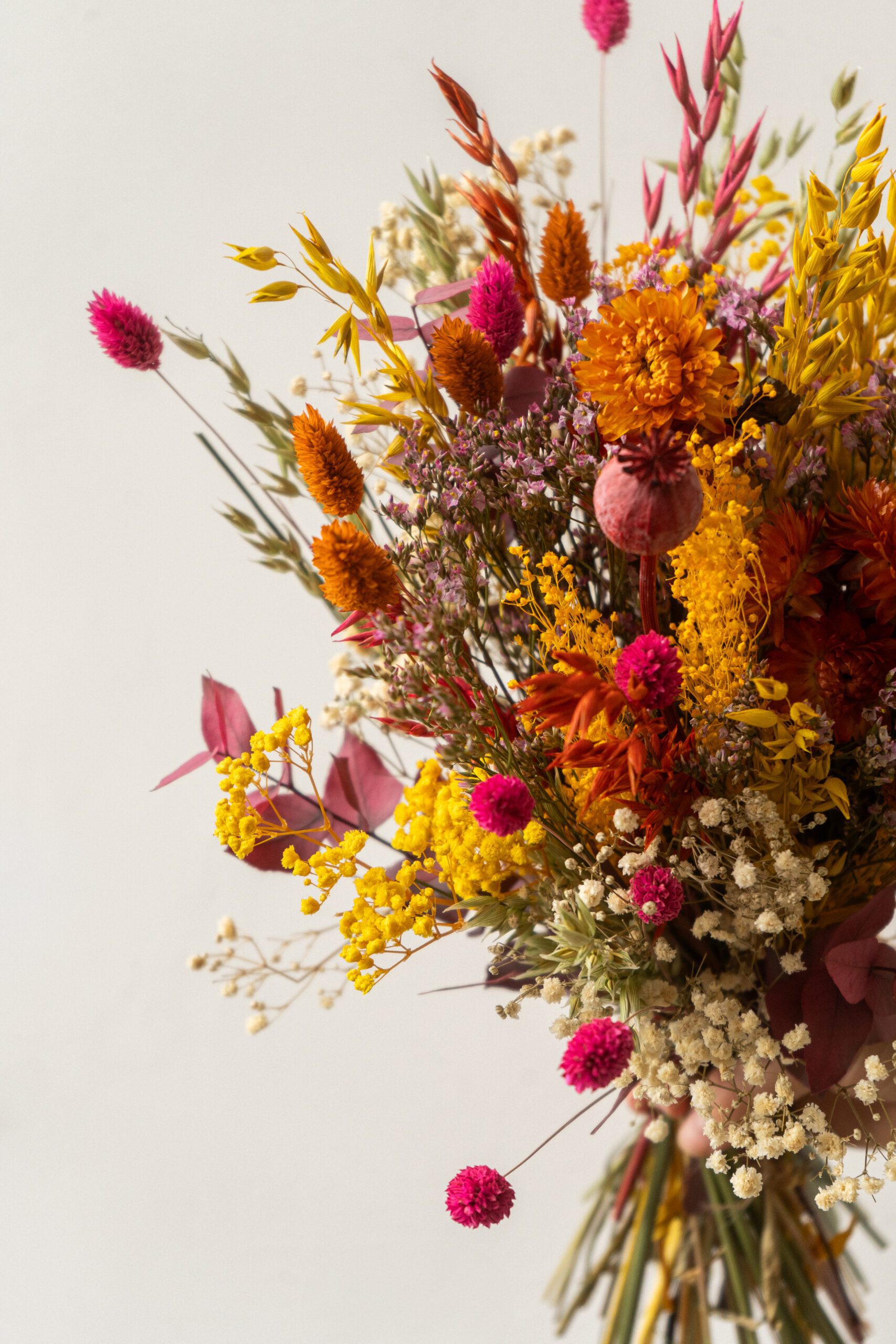 Le bouquet “Soleil Perpétuel” est une ode à la couleur et à la durabilité. Composé uniquement de fleurs séchées aux teintes vibrantes — jaunes solaires, oranges éclatants, rouges profonds et touches de rose fuchsia — il symbolise un amour qui dure et ne fane jamais. Une belle attention pour une maman rayonnante, à garder précieusement toute l’année.